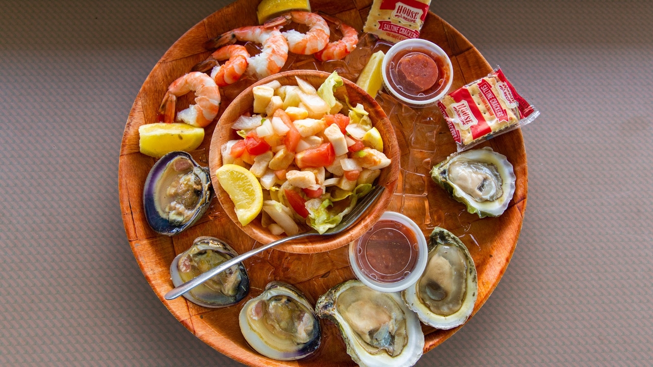 Get it all raw! Raw topnecks (3), raw oysters (3), shrimp cocktail (5), & conch salad (small)